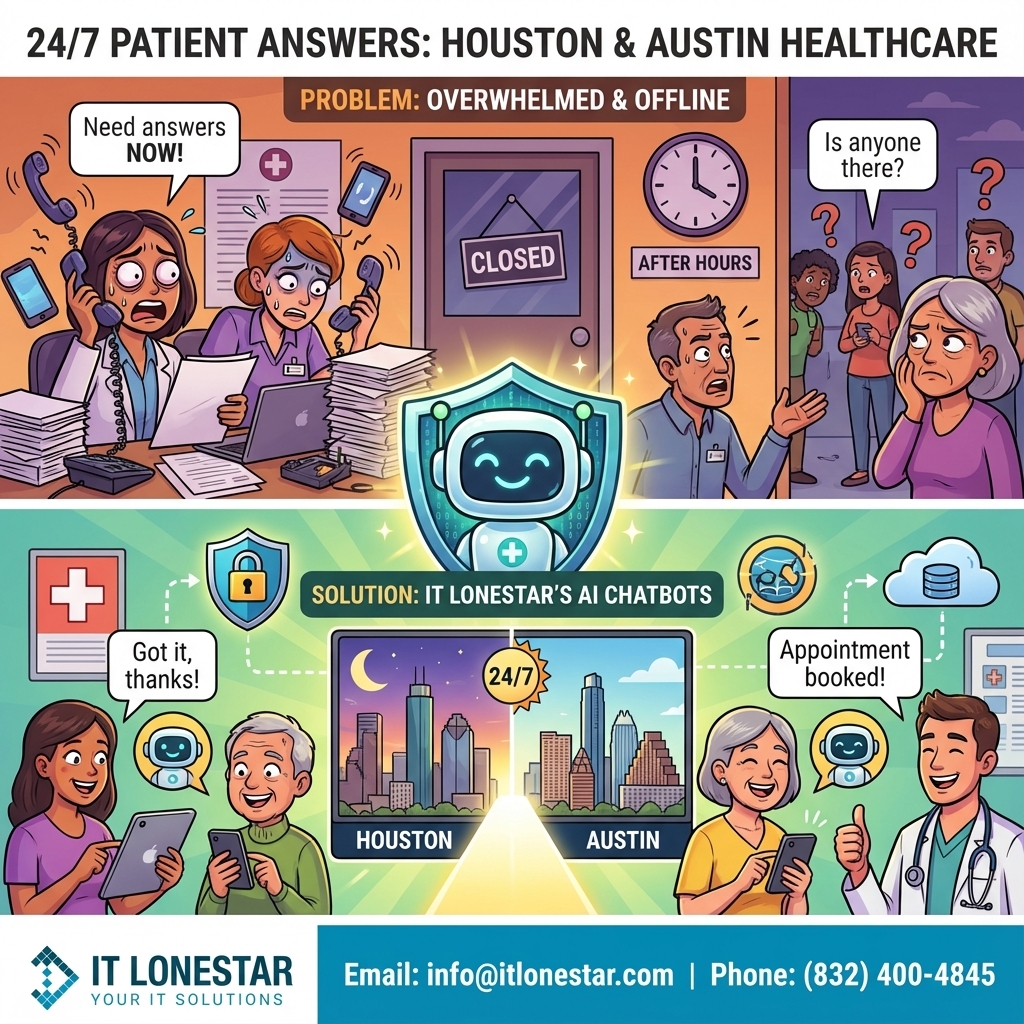 This is an educational article for your website explaining how AI chatbots, implemented and supported by IT LONESTAR, provide 24/7 patient answers for clinics, medical practices, and healthcare networks in Houston and Austin. It positions IT LONESTAR as the specialized IT partner that designs, deploys, secures, and manages these AI chatbot solutions for local healthcare organizations.