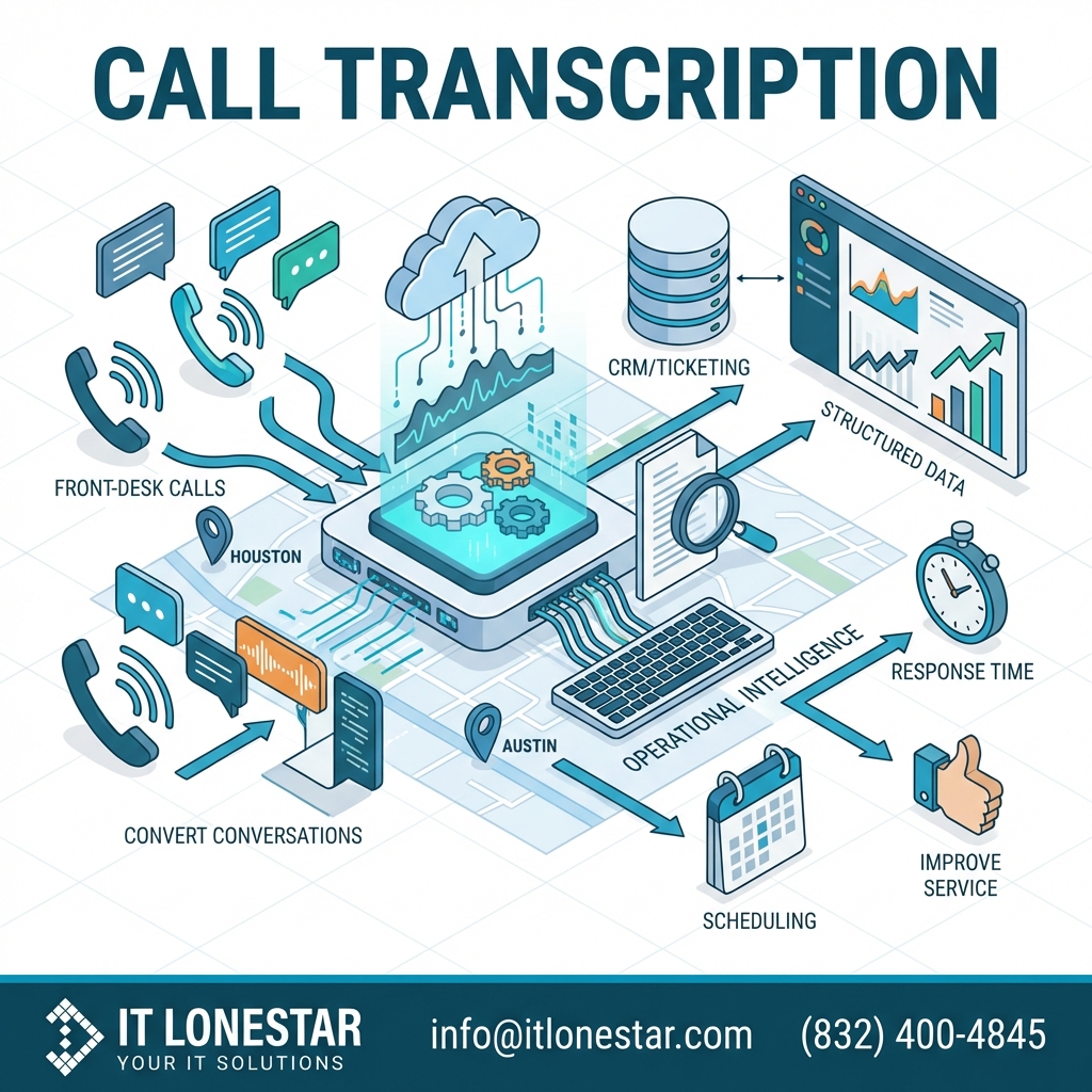 IT LONESTAR helps organizations in Houston and Austin turn raw phone conversations into structured, actionable data by deploying and integrating call transcription into their existing IT environment. 1. Strategic assessment and design We begin by evaluating your current phone system, call flows, and front‑desk workload. We identify where information is being lost—such as during high‑volume periods, shift changes, or escalations to IT support. Based on this, we design a transcription strategy that aligns with your workflows, compliance needs, and preferred tools (VoIP, CRM, ticketing platforms, and collaboration apps). 2. VoIP and transcription integration We implement modern VoIP solutions with native or API‑based transcription. Every inbound and outbound front‑desk call is automatically recorded and transcribed. These transcripts are securely stored and can be linked directly to: – Help desk / ticketing systems for faster, more accurate ticket creation – CRM records for complete customer histories – Shared inboxes or collaboration tools for team visibility 3. Workflow automation for front‑desk efficiency IT LONESTAR configures automations such as: – Auto‑generated ticket summaries from call transcripts – Keyword‑based routing (e.g., “outage”, “server down”, “password reset”) to appropriate teams – Standardized call notes that reduce manual typing and follow‑up errors 4. Training, security, and compliance We train front‑desk staff and managers on how to search, filter, and use transcripts effectively. At the same time, we enforce encryption, access controls, and retention policies to protect sensitive information and meet regulatory requirements relevant to Houston and Austin businesses. 5. Continuous optimization and analytics By analyzing transcript data, IT LONESTAR helps identify recurring issues, peak call times, and training opportunities. Over time, this leads to shorter call durations, fewer repeated calls, clearer tickets, and a measurable boost in front‑desk productivity. The result is a front desk that operates with the precision of a digital system—backed by IT LONESTAR’s local expertise and managed support in Houston and Austin.