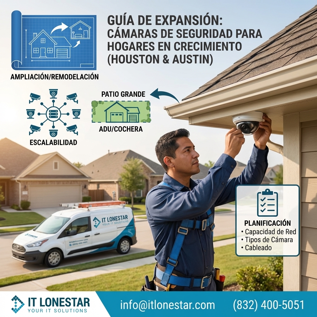 Este es un artículo-guía de IT LONESTAR Solutions para propietarios de vivienda en Houston y Austin que quieren ampliar su sistema de cámaras de seguridad cuando su casa crece: ya sea porque hacen una ampliación, remodelan, añaden un patio trasero más grande, una cochera adicional o construyen un ADU (departamento anexo). Explica, en lenguaje claro, qué aspectos técnicos y de planificación deben considerar para que la expansión sea segura, escalable y compatible con la infraestructura de red existente.