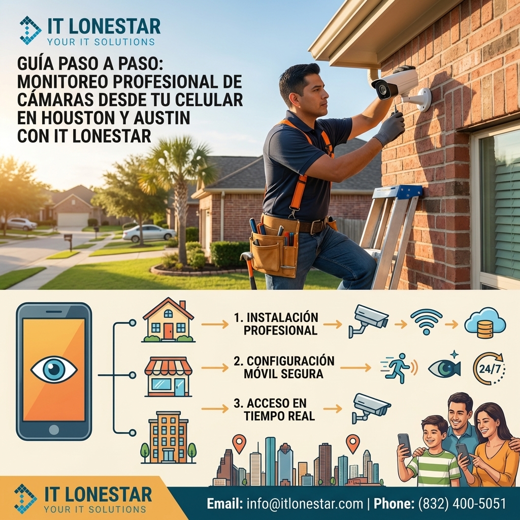 Si estás en Houston o Austin y quieres ver las cámaras de tu casa desde el celular de forma sencilla y segura, IT LONESTAR Solution puede encargarse de todo: desde el diseño e instalación hasta la configuración en tu smartphone y el soporte continuo.