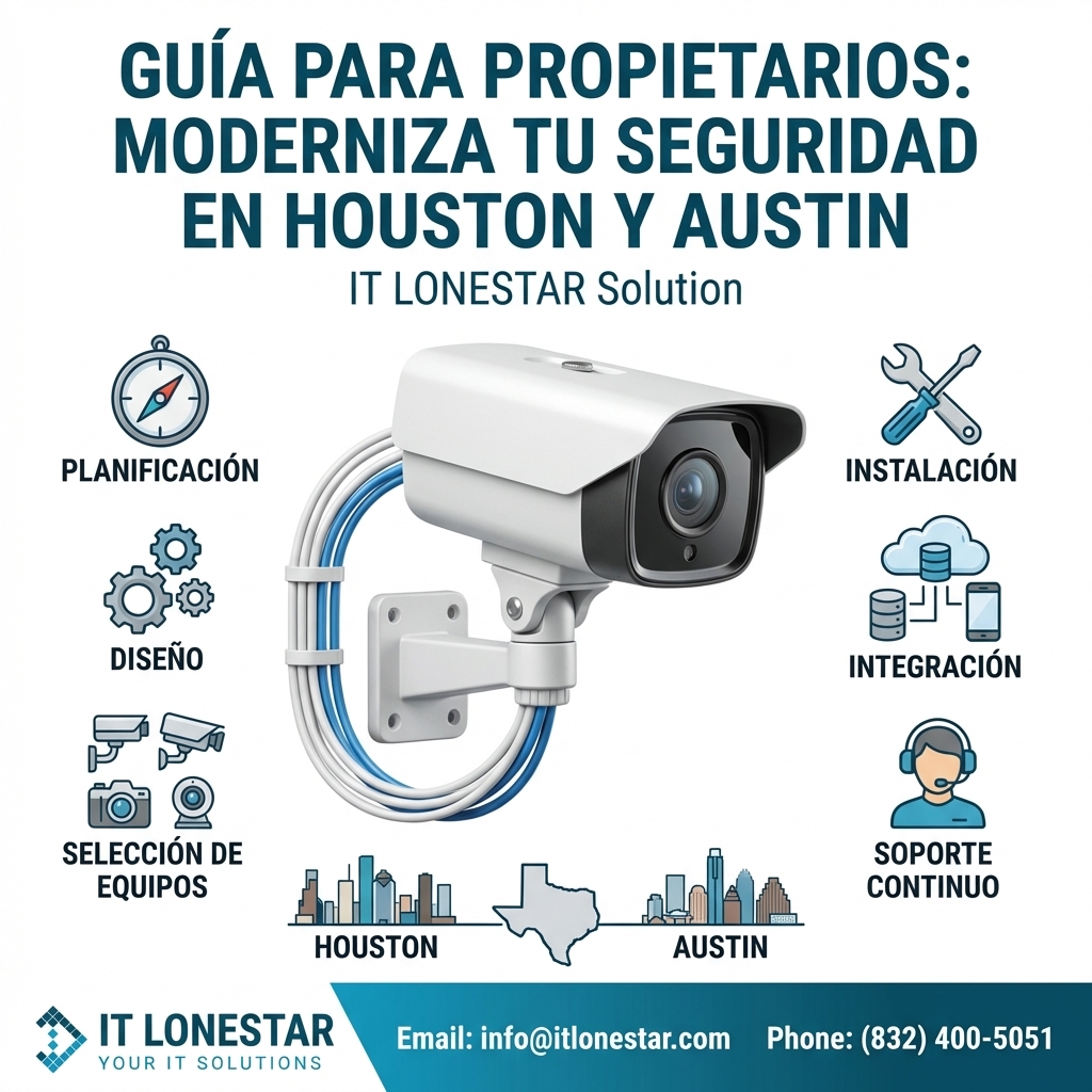 Este es una guía completa para propietarios en Houston y Austin que desean ampliar o modernizar su sistema de cámaras de seguridad en casa, apoyándose en los servicios profesionales de IT LONESTAR Solution. Cubre desde la planificación inicial y el diseño, hasta la selección de equipos, instalación, integración con redes y soporte continuo, siempre con foco en las necesidades y particularidades de estas dos ciudades de Texas.